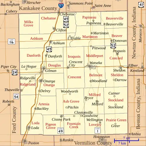 The county is bisected by the east–west U.S. Route 24, which passes through Gilman, Crescent City, the county seat of Watseka, and Sheldon.
