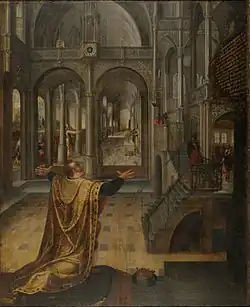 The Germanisches Nationalmuseum in Nuremberg, Germany holds a nine-part ceiling painting, which is permanently installed in a ceiling in one of its rooms. It shows allegorical and biblical scenes in three rows of three pictures. Their interpretation is not always clear. Whether the arrangement in the museum reflects the original one remains open. Van Blocke likely created the ceiling for a room in Danzig City Hall. It confirms the popularity of inventive emblematic iconographic programs in Danzig. Some scenes are based on prints by Netherlandish masters. Some of the depictions can be interpreted easily. For example, the scene with Minerva standing behind a man holding a compass personifies the liberal arts. Other paintings in the programme are less obvious.[5]