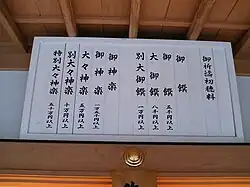The shrine was foremost among a group of shrines which became objects of imperial patronage in the early Heian period.[11] In 965, Emperor Murakami ordered imperial messengers to be sent to report important events to the guardian kami of Japan. These heihaku were initially presented to 16 shrines including the Ise Shrine.[12]