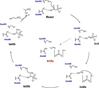 - ^ a b c Deng WH, Lu Y, Liao RZ (December 2021). "Revealing the Mechanism of Isethionate Sulfite-Lyase by QM/MM Calculations". Journal of Chemical Information and Modeling. 61 (12): 5871–5882. doi:10.1021/acs.jcim.1c00978. PMID 34806370. S2CID 244518952.