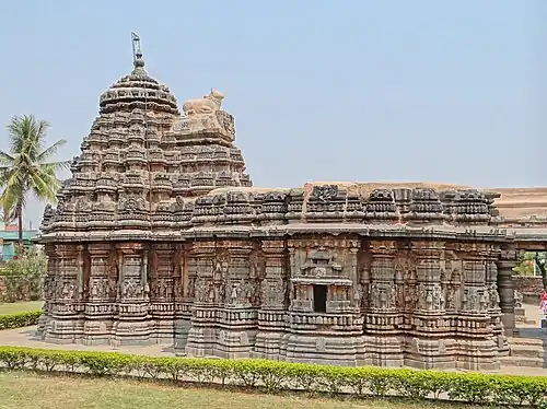 The outer wall of the vestibule shares the same decoration as the outer wall of the shrine, but is inconspicuous because it forms a short continuation between the wall of the shrine and that of closed mantapa.[8] The outer wall of the shrine is stellate, but the star points are not identical, rather they form three different kinds of star points, making the design complicated and unusual.[9] The lower half of the outer wall of the shrine and the outer wall of the closed mantapa share the same architectural articulation. The open hall, with its 16-pointed star plan is unusual. The central ceiling in the closed mantapa and the vestibule are decorated elaborately.[9]