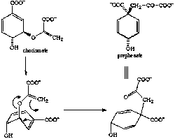 Chorismate mutase is an intramolecular transferase and it catalyzes the conversion of chorismate to prephenate, used as a precursor for L-tyrosine and L-phenylalanine in some plants and bacteria. This reaction is a Claisen rearrangement that can proceed with or without the isomerase, though the rate increases 106 fold in the presence of chorismate mutase. The reaction goes through a chair transition state with the substrate in a trans-diaxial position.[12] Experimental evidence indicates that the isomerase selectively binds the chair transition state, though the exact mechanism of catalysis is not known. It is thought that this binding stabilizes the transition state through electrostatic effects, accounting for the dramatic increase in the reaction rate in the presence of the mutase or upon addition of a specifically-placed cation in the active site.[13]