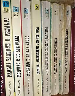 Alongside its maps I.G.C. also published the Guide IGC, a serie of guide books signed by the alpinist Giulio Berutto, who was one of the authors of CAI reference books making up the Guida dei Monti d'Italia. Each of Berutto's guide book, consisting in one or two volumes, covers the area of one of the 1:50,000 IGC map with a wide range of hiking, climbing and mountain bike itineraries.[8] Despite its author's death in November 2004,[9] which stopped further issues of the serie, many of the Guide IGC are still considered a reference by hikers and alpine huts managers.[10]