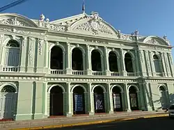 Between 1890 and 1899, more than 6,500 Italians arrived in the country, the vast majority arriving at the port of Libertad, and among them several architects and other Italian professionals arrived, such as those who built the Teatro de Santa Ana in Santa Ana. In 1890, in fact, the construction of the Theater was entrusted to the company Sociedad Constructora de Occidente, directed by the Italian architects Francesco Durini Vasalli and Cristóbal Molinari.[16] In turn, the Italian artists Luis Arcangeli and Guglielmo Arone were hired. The theater's original curtain was in the Modernisme style, created by the Italian artist Antonio Rovescalli. Many other Italians have built various palaces and monuments in El Salvador.[2][1] In fact, in the country there are many churches and houses of Italian style, an example is the Iglesia del Calvario in Santa Ana, which was built and designed with the support of the Italians.[17]
