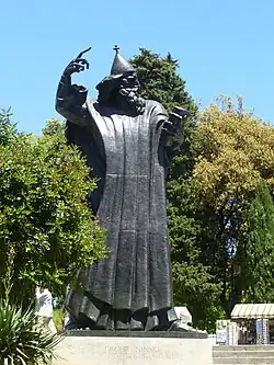 Meštrović became a supporter of Yugoslavism and Yugoslav identity after he traveled to Serbia and became impressed with Serb culture.[6] He created a sculpture of Serbian folk-legend hero Prince Marko for the International Exhibition of Art (1911), which was exhibited along with 73 sculptures at the pavilion of Kingdom of Serbia.[7] When asked about the statue, Meštrović replied "This Marko is our Yugoslav people with its gigantic and noble heart".[6] Meštrović wrote poetry speaking of a "Yugoslav race".[6] Those who knew Meštrović's views referred to him as "The Prophet of Yugoslavism".[6] He also participated in 1911 at the Turin International.