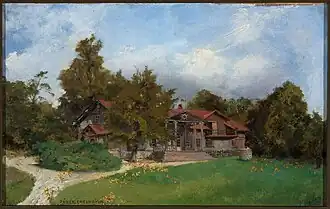 Józef Chełmoński's Manor House in Kuklówka Zarzeczna is a wooden manor house in Kuklówka Zarzeczna, Żyrardów County, dating from the second half of the 19th century,[1] listed in the registry of immovable monuments of the Masovian Voivodeship. It belonged to the painter Józef Chełmoński, who lived and worked there for approximately 25 years, and subsequently became the property of his descendants. An oil painting entitled Villa in the Garden, depicting the manor house, created by Chełmoński, is in the collection of the National Museum in Warsaw.[2]