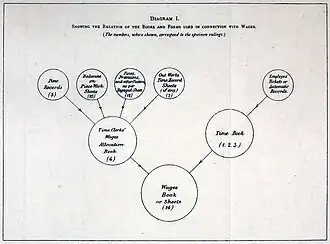 In a diagram of manufacturing accounts, Slater Lewis explained how "scheme of production and cost control is unfolded in its logical flow."[14] This diagram was based on the scheme, that pictured how to incorporate labour costs into the factory accounts, presented by Garcke and Fells in 1887/89 (see above). Urwick & Brech (1946) more specifically explained: