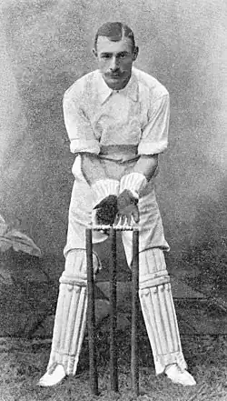 Jack Board was a wicketkeeper and a right-handed batsman who started out as a tail-ender but developed into a useful player who often opened the innings for his county, Gloucestershire. Picked by W. G. Grace out of Bristol club cricket for the South v North match at Lord's in 1891, Board went straight into the Gloucestershire side afterwards and stayed there for 20 years. In 1895, he set the county record for dismissals in a season, with 75. He had few equals as a catcher, his takes from Fred Roberts were recalled many years later.[1] As a batsman, he scored 214 in 210 minutes against Somerset in 1900,[2] the highest by a Gloucestershire wicketkeeper, and in 1903 he shared in a sixth wicket partnership of 320 with Gilbert Jessop against Sussex at Hove, though his share was just 71, while Jessop scored 286.[3] The stand remains the county record for the sixth wicket. Gilbert Jessop said he transformed himself by sheer hard practice from a batsman of uncouth methods into one of much reliability, although "the majority of his runs were made on the on-side, and the manner in which he 'huddled' in front of his wicket made one tremble for his fate every ball."[1] He was also renowned as a poor judge of a run: "the number of friends run out by him must have exceeded by far the number of foes."[1]