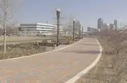 In January, 2005, a ribbon-cutting ceremony was held to celebrate the opening of the latest extension of the Northbank Riverwalk. Construction took nearly two years for the 1.5-mile (2.4 km), $8.7 million project. The landscaped brick walkway connects the existing Riverwalk at the CSX building to Riverside Avenue. Its features include historical lighting, water fountains, trash receptacles, bike racks, irrigated landscaping and over 100 benches.[3]