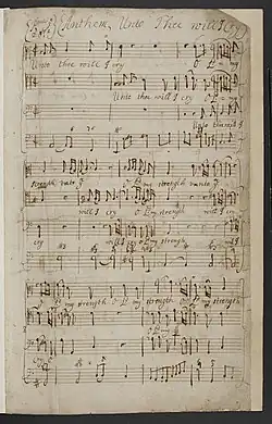 He composed anthems and other works, but because of a misunderstanding between him and the dean and chapter of the cathedral, he destroyed a large part of them.[3] However six were published in A Collection of Anthems (1749).[1]