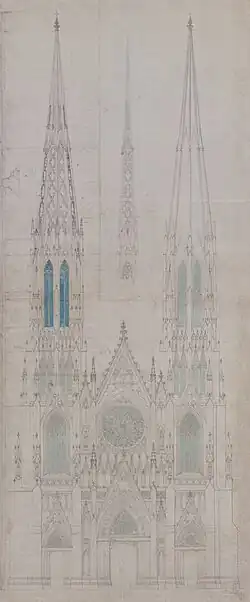 Renwick went on to design St. Patrick's Cathedral, on the corner of Fifth Avenue and 51st Street, which is considered his most notable architectural achievement. He was chosen as architect for the Roman Catholic cathedral in 1853; construction began in 1858, and the cathedral opened in May 1879.[5] The cathedral is the most ambitious Gothic-style structure, and includes a mixture of German, French, and English Gothic influences.