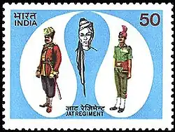 Commemorative stamp celebrating the Jat Regiment in uniforms of the regiment, past and present