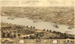 Jefferson City is located on the northern edge of the Ozark Plateau on the southern side of the Missouri River in a region known as Mid-Missouri, that is roughly mid-way between the state's two large urban areas of Kansas City to the west and St. Louis in the east (along the west bank of the Mississippi River). It is 29 miles (47 km) south of Columbia, Missouri, and sits at the western edge of the Missouri Rhineland, one of the major wine-producing regions of the Midwest. The city is dominated by the monumental domed Missouri State Capitol, which rises from a bluff overlooking the nearby Missouri River to the north. Lewis and Clark with their Corps of Discovery passed the bluff here on their historic expedition upriver in 1804, eventually journeying westward to the Pacific Northwest region and the Pacific Ocean, before Europeans or Americans established any settlement there.