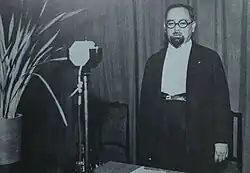 Immediately after Japan's surrender on 15 August 1945, Matsumoto ordered a large quantity of rice balls to be distributed to the homeless at Hakata Station.[4] He was centrally involved in the founding of the Japan Socialist Party (JSP) in November 1945, and his home in Fukuoka became the base for both the new party and the revived Buraku liberation movement.[45] He quickly re-established himself as a national figure, advocating for republicanism and proposing a "Japanese Union of Republics" to replace the emperor-centered state.[46] In January 1946, he chaired the founding conference of the National Committee for Buraku Liberation (部落解放全国委員会, Buraku Kaihō Zenkoku Iinkai), the successor to the Suiheisha.[47]