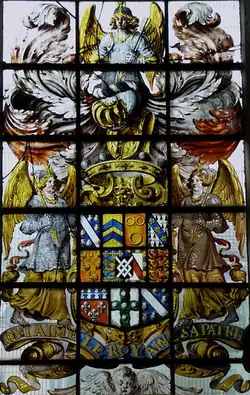 In the Frescheville Chapel within the Church of St John the Baptist, Staveley, survives a fine heraldic stained glass window, made in 1676 by Henry Gyles of York, in memory of the 1st Baron. In the centre is a shield of 11 quarters with inescutcheon of pretence of Harington (Sable, a fret azure), for Sarah Harington, his 2nd wife. In the two supporting lights of the window are four further shields:[6] 1: Frecheville impaling Nicholls (Azure, a fess between three lion's heads and necks erased or) (his first marriage) top left; 2: Frecheville alone, bottom left; 3: Frecheville with an inescutcheon of Harington (his second marriage) bottom right; 4: Frecheville impaling De Vick (Or, three caltraps sable, on a chief azure a lion's head and neck erased or) (his third marriage) top right.[7][8]