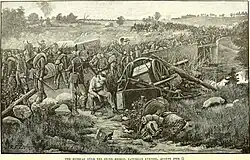 In January 1910, Mills presented a painting of the new commander of the Chapin Post at a GAR reception.[111] In 1911, Mills visited Bull Run for the 50th anniversary of the battles there, and made some commemorative portraits.[112] Mills wrote a memorial poem for Gettysburg, "To the devoted departed".[113] He was honored at a GAR gathering for Gettysburg,[114] and later at a reunion of veterans of the 21st Regiment.[115] He remained an elected officer of the GAR corps until his death.[116]