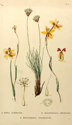 Lindley described the plants collected on Thomas Livingstone Mitchell's expeditions of 1838 and wrote an Appendix to Edwards's Botanical Register of 1839, describing plants collected by James Drummond and Georgiana Molloy of the Swan River Colony in Western Australia.[8] According to John Ryan, Lindley's 1840 'Sketch of the Vegetation of the Swan River Colony' provided 'the most succinct portrait to date of the flora of the Swan River Settlement', which had been established in 1829.[9] The Sketch, which was published during November 1839 and January 1840 in Edwards' Botanical Register and separately on its completion, was illustrated by nine hand-coloured lithographs and four wood-cuts.[9] He also played a large part in having Charles Moore appointed as Director of the Sydney Botanical Gardens.