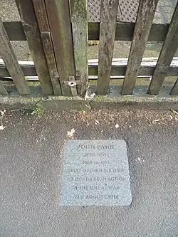 On the 100th anniversary of Parr's death a memorial paving stone was laid in the pavement outside his home at 52 Lodge Lane. The unveiling ceremony was attended by about 300 people, including local dignitaries and Parr family members, one of whom read a letter from his mother to the War Office written in October 1914 enquiring about his fate. A memorial "standing stone" nearby, to bear a plaque with further details of Parr's life and death, is planned. A plaque has also been placed in the golf club where he worked as a caddie.[9][10]