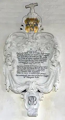 A mural monument exists in St Peter's Church, Tawstock (by Thomas Jewell of Barnstaple[10]) to Florence Rolle (d. 1705), daughter and sole heiress of Denys Rolle (1614–1638) of Stevenstone and wife of Sir John Rolle (d. 1706) of Marhayes. It was erected by her daughter Margaret Rolle,[11] a spinster who had apparently moved to Tawstock Court, the home of her sister Florence Rolle (Lady Wrey), the widow of Sir Bourchier Wrey, 4th Baronet (d. 1696). The inscription is as follows: