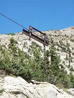 The district includes a mining adit and stope, an aerial tramway, four log structures, a log ore mill, a stable, trash dumps and a dam on Johnson Lake. Three cabins were built for accommodations, three small cabins for sleeping and storage, and a larger communal cabin. There is also evidence of tent platforms.[2] The site is well preserved, with some of the mining equipment intact. The aerial tramway transported ore from the mine 300 m (980 ft) across a steep slope to a terminal building, where the ore was packing in barrels and hauled by mule 1.1 km (0.68 mi) to the mill. The milled ore was then packed 1.8 mi (2.9 km) to the location of the present Shoshone Campground and further transferred 18 mi (29 km) to Garrison, Utah. From Garrison the ore went 75 mi (121 km) to the railroad at Frisco, Utah.[3]