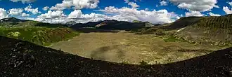 The field contains scoria cones, lava flows[3] and small cinder cones. Pyroclastic cones in the field include Atkinson, Kropotkin (2,077 metres (6,814 ft) and 52°42′0″N 98°59′0″E / 52.70000°N 98.98333°E),[2][12] Medvedev,[13] Ostanets Group ("remnants" in Russian), Peretolchin (2,050 metres (6,730 ft) and 52°43′0″N 98°58′0″E / 52.71667°N 98.96667°E), Pertolichina (2,050 metres (6,730 ft) and 52°43′0″N 98°58′0″E / 52.71667°N 98.96667°E), Pogranichniy ("border" in Russian, being located between two other flows), Stariy ("old" in Russian, 2,030 metres (6,660 ft) and 52°36′0″N 98°54′0″E / 52.60000°N 98.90000°E), Treshina ("fissure" in Russian) and Troynoy ("triplet" in Russian, three 10 metres (33 ft) high domes).[2][12] Most of these cones are located within the Hee-Gol valley rather than the Jom-Bolok valley itself.[14] These cones are constructed on top of three different faults.[12]
