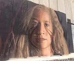 Jorit described a mural of a young girl that he made in July 2023 on a bombed-out building in occupied Mariupol (after a siege that the Red Cross called "apocalyptic"), as seeking to present a narrative of the bombing of the city and its inhabitants by "NATO missiles".[22] He also said the mural was "a living little girl from Donbas who spent her first years in Mariupol surrounded by war".[22] Australian photographer Helen Whittle protested that the mural is based on a photo of her daughter and unauthorized.[22][23] Jorit later said he had come across the photo by searching on Google for "pigtails", and he had redrawn the shirt and the pigtails.[22] Jorit's mural was criticised on the basis that the bombs that killed children in Mariupol were Russian, and that the Mariupol hospital airstrike was attributed to Russian forces.[22] Critics also questioned the appropriateness of Jorit's mural after Russian forces had previously removed a mural by Sasha Korban in Mariupol that depicted a Ukrainian girl who lost her leg and her mother in an artillery rocket attack by pro-Russian separatist forces in 2015.[7][22][24]