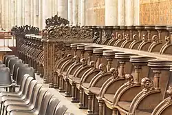The choir stall of Cologne Cathedral consists of wooden seats. Two longitudinal rows of them are installed each on the northern and southern side of the cathedral choir, just in front of the chancel screens. The front rows are divided in two equal parts each, to provide access to the row behind.