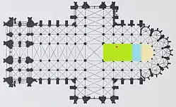 In 2017, the cathedral chapter and Cologne Society for Christian-Jewish Cooperation created a dedicated working group on the same issues, titled "The Cathedral and 'the Jews'." In 2023, the group launched an art competition to add a new piece of art to the cathedral that examined the present and future of Jewish-Christian relations in awareness of their full past.[18] By 3 April 2025, the Cologne Cathedral International Art Competition ended with Andrea Büttner winning for her mural exposing hidden Jewish history in the cathedral. The mural will be in the Chapel of St. Mary, above and behind the existing Altarpiece of the Patron Saints of Cologne. The mural depicts a life-size realistic painting of the stone base of a Torah ark, the same base the altarpiece later originally rested on. This is because the altarpiece was created for the St. Maria in Jerusalem chapel, which replaced a synagogue in 1424, the year after Cologne expelled all its Jews from the city. The mural will show the stone base floating above the altarpiece. Büttner stated that she didn't believe art could make the cathedral's many antisemitic pieces more tolerable by commentary, and instead wanted her piece to "take something that has been hidden from the cathedral's visitors up to now and have it openly displayed in a central location."[19]