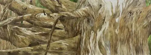 After moving to the West, Belzer shifted to larger forms—oak and eucalyptus trees—in detailed, monumental works that examined rotting trunks, exfoliating limbs and densely interwoven branches, whose patterns echoed those of organic forms such as skin tissue, body parts, mountainsides.[1][5][4] Her "Inner Life of Trees" series (2007–08) often employed multiple panels. Fusing realism and abstraction, they evoked a sense of penetrating trees' interiors or physically tracing concentric rings and bark ridges that echoed the movement and rhythms of ocean waves or sand.[1][34][3] The "Order of Things" paintings (2009–10) combined a sense of scientific naturalism with expressionist abstraction in examinations of patterns created by natural processes (e.g., cracks and fissures in lateral sections) that seemed to connections micro and macro (landforms, city maps) structures and surfaces.[7][25]