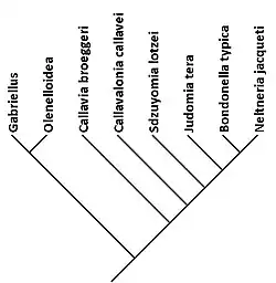 - ^ a b c d e f Lieberman, B.S. (2001). "Phylogenetic analysis of the Olenellina Walcott, 1890 (Trilobite, Cambrian)". Journal of Paleontology. 75 (1): 96–115. doi:10.1666/0022-3360(2001)075<0096:paotow>2.0.co;2. S2CID 85656419.