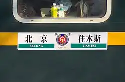 The K339/340 Beijing–Jiamusi through train (Chinese: K339/340次北京到佳木斯快速列车) is a railway running from Beijing to Jiamusi.[1] It carries express passenger trains for the Harbin Railway Bureau. The Jiamusi passenger segment is responsible for passenger transport. Jiamusi originates on the Beijing train. 25G Type Passenger trains run along the Jingqin Railway, Shenshan Railway, Hada Railway, Binbei Railway and Suijia Railway across Heilongjiang, Jilin, Liaoning, Hebei, Tianjin, Beijing and other areas. The route covers 1675 km. Beijing railway station to Jiamusi railway station runs 23 hours and 27 minutes. Jiamusi railway station to Beijing railway station runs 24 hours and 18 minutes.