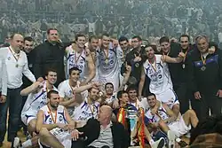 Along with the performance in the Eurocup, MZT also competed in the ABA League. MZT appointed Zoran Martić as their new head coach. Instead of desired sixth place in the ABA League, MZT ended the season in ninth place. In February 2014, MZT won the National Cup by defeating Lirija in the final. After that, MZT won ten league games in a row. In the semifinals of the league, the opponents were again Lirija, which MZT eliminated with a score of 2–0 in series. In the final, MZT Skopje defeated "eternal rivals" Rabotnički. The series ended with a 3–1 victory, and MZT won the league for the third season in a row.[6] Prior to the 2014–15 season, many of the players has left the club, and Zmago Sagadin[7] was appointed a new coach. He was sacked shortly after the season began, and was replaced by Vrbica Stefanov. Stefanov was also sacked during the season, and was replaced by Bobi Mitev.[8] Mitev resigned after the series of defeats, and was replaced by Aleksandar Jončevski, who used to be an assistant coach during the mandates of all previous coaches. The elimination from the Macedonian Cup in the semifinals by Kozuv and the next-to-last place in the ABA League meant resignation for Jončevski. He was replaced by Aleš Pipan, who became the fifth coach in the season. In the semifinals of the league, MZT eliminated Feni Industries, while in the finals, the team defeated the Kumanovo team, winning the championship for the fourth time in a row.[9] Aleš Pipan was appointed as a head coach again in the 2015–16 season. After mixed performances in the ABA League regular season, the head coach Aleš Pipan was replaced by Aleksandar Jončevski. MZT ended the ABA League season in the tenth place. In domestic competitions, MZT won another cup and league "double", becoming the champions for the fifth time in a row.[10]