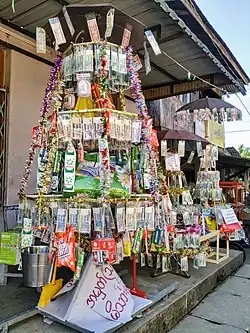 Kathein (Burmese: ကထိန်, from Pali ကထိန) refers to the ceremony during which yellow robes called matho thingan (မသိုးသင်္ကန်း) are offered to the sangha between the first waning day of Thadingyut (သီတင်းကျွတ်, approximately October) and the full moon day of Tazaungmon (တန်ဆောင်မုန်း, approximately November)[11] in the Burmese calendar. During this period, certain rules of the Vinaya are relaxed for monks.[11] Kahtein trees called badaytha bin (ပဒေသာပင်), on which offerings like money are hung, are also offered.[12] Kahtein trees can also be portrayed by using Kyat money between ten and hundred thousand as desired.[13]