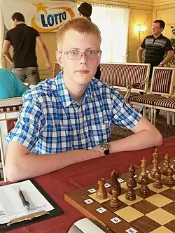 Kacper Drozdowski learned to play chess at the age of five. He participated in the Polish Youth Chess Championships in different age groups, which have won five medals: three gold (in 2006 in U10 age group, in 2010 in U14 age group, in 2011 in U16 age group), silver (in 2012 in U18 age group) and bronze (in 2009 in U14 age group). In 2010, he won bronze medal with Jaworzno chess club JKSz MCKiS in Polish Youth Team Chess Championship.[1] Kacper Drozdowski has successfully participated in Polish Youth Championships in blitz and fast chess. He is four-time Polish Youth Fast Chess Champion (in 2008 in U12 age group with time control 15 and 30 minutes for game, in 2011 in U16 age group, in 2014 in U18 age group). In 2007, Kacper Drozdowski won Netherlands Open Youth Chess Championship. In 2012, in Prague he won European Youth Chess Championship in U16 age group. In 2013, he debuted in the final of the Polish Chess Championship. In February 2014, in Budapest Kacper Drozdowski shared 1st place in International Chess Tournament First Saturday.[2]