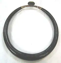 Kalabubu, sometimes spelled Kala bubu, is a torc (stiff circular necklace) worn by warriors of the people of South Nias of North Sumatra, Indonesia. Kalabubu symbolizes triumph in warfare and heroism. Wearing a kalabubu was believed to protect the wearer from harm.[1] Kalabubu is popularly known as the "headhunter's necklace"; historically only those who already decapitated the head of the enemy tribes are allowed to wear the kalabubu.