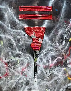 Kaloust Guedel's work explores contemporary issues often taking a critical stand on various societies shortcomings. Throughout the years, it has explored subjects as genocide, war, abuse and others.[8] Regardless of the styles and technics he has employed, his work has been consistent with contemporary sensibility and has reflected the consciousness of its time. Guedel is the first artist who used vinyl as a medium in paintings. He has been featured in publications like Masters of Today and has been known to explore capitalism and excess in his minimalist conceptual artworks.[9]