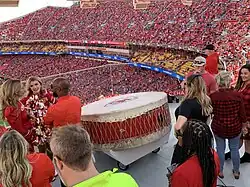 After the Washington Redskins and Cleveland Indians announced in July 2020 the process of reviewing their names, the Chiefs did not respond to a request for comment.[26] The editorial board of the Kansas City Star stated that "It's time for a real examination of all of it: the tomahawk chop, the drum, Arrowhead Stadium, Warpaint, and the costumes worn by fans at the game."[27] On August 20, 2020, the Chiefs announced that headdresses and Native American style face paint would be banned at Arrowhead Stadium.[28] Under the new Arrowhead policy, the portion of the tomahawk chop led by Kansas City Chiefs cheerleaders was subtly modified, now required to lead the chop with a closed fist rather than the traditional open palm.[29]