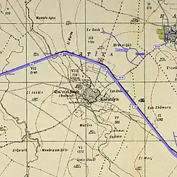 Karatiyya was captured by the Israeli Army's 89th Mechanized Battalion, commander Moshe Dayan, on July 18, 1948, as part of Operation Death to the Invader. Its inhabitants fled upon their arrival, according to Dayan.[30] According to Benny Morris, the village "was harassed by machine-gun fire and abandoned by its inhabitants".[31] Israeli forces intended to link their northern territory with that held by Israeli forces in the Negev, but succeeded only partially, only taking control of Hatta and Karatiyya. After it was stormed by Dayan's troops he controversially withdrew them leaving a Givati infantry company to hold the position.[32] A fierce battle ensued between them and the Egyptian Army who got as far as the village outskirts. When two Egyptian tanks were on the verge of breaking the Israeli defenses from the south, a unit hiding behind a wall of prickly pear cacti, armed with anti-tank weapons "changed the course of the battle", according to Haganah accounts.[6]