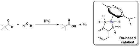 The reaction of pivaldehyde with water catalyzed by para-cymene Ru complexes to form a carboxylic acid and hydrogen gas.