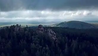 The name Karkaraly means "arrow-headed" in the Kazakh language[2] Karkaraly city lies at the feet of the eastern slopes of the mountains and Karagaily village, a little further east. A large sector of the range is part of the Karkaraly National Park, a 112,120 hectares (277,100 acres) protected area established in 1998.[3][4]