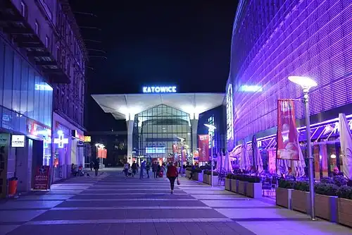 During July 2009, it was announced that the Polish government had signed a construction agreement with the Spanish construction firm Neinver, under which the latter would perform the construction of a new integrated transportation hub and commercial center in the middle of Katowice.[1] This programme involved the reconstruction of the existing railway station, along with the construction of an underground bus station, an adjacent shopping center (Galeria Katowicka) and an office tower;[2] other changes included the reconfiguring of various streets, sidewalks and public space located around the railway station. The underground part of the complex will feature new multi-storey car parking facilities. Reportedly, the overall investment was estimated in 2009 to come to around 240 million euros.[1][3]