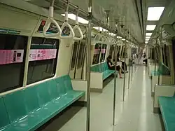 The Mitsubishi Electric propulsion system was retained, having performed better than expected.[37] The wheelchair space was made available at the end of two mid-train cars, nearest to the elevators in elevated stations. Each three LED lights (top) that blink to warn passengers of closing doors were also introduced in the upper middle section of the door.[37] Additional loud speakers and advertisement panels were added. Handgrips were moved to the support stanchion bars of the seats on the ceiling, and grab bars were located near the doors and at both ends of each car. The air-conditioning system was modified to match the system used in the C751B cars, with air-conditioning vents and in-flow fans installed.[37]
