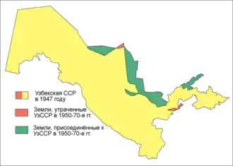 It appears that there were various small changes to the border in the following decades.[32] Many older maps show a slightly different boundary in the Kara-Kum desert, with a large triangular protrusion of Uzbek territory into what is now Kazakhstan's Kyzylorda Region (see maps right). According to the Resolution of the Presidium of the Supreme Soviet of the USSR of February 13, 1956, Mirzachoʻl desert and Boʻstonliq District was separated from Kazakh SSR (South Kazakhstan Region) and added to Uzbek SSR along its northeastern frontiers. In 1963, in accordance with the decision of the Presidium of the Supreme Soviet of the USSR, an additional 36,600 square kilometers of territory was transferred from South Kazakhstan and Kyzylorda regions of Kazakh SSR.