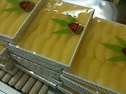 There were kazunoko remolded into disks or squares after being dissembled, called yose kazunoko, which used to be presented to the shogun, as aforementioned.[96][99] In more recent times, stray eggs gathered were salvaged and solidified together, then cut out into flower-shapes, to be sold as hana kazunoko.[142] Also imitation kazunoko have been made using capelin eggs as substitute[27] (though stray herring eggs may also be added[143]).