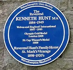 Individual A Blue plaque was erected in Hunt's honour on 28 October 2004 at St Mark's Church, Chapel Ash[6] by Wolverhampton Civic Society and Wolverhampton Wanderers.[7]