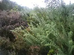 Kersal Moor is one of the many fluvioglacial ridges that formed along the Irwell Valley during the melting of the glaciers at the end of the last ice age.[6] Typically for this type of landform, the subsoil is composed of sand mixed with coarse gravel. The 19th century botanist Richard Buxton described this as "Mr E.W. Binney's drift deposit no.2 ... a deposit of sharp forest sand, parted with layers of gravel composed of Azoic, Palaeozoic and Triassic rocks, well rounded, parted with layers of fine sand, and having every appearance of a regular deposit by water."[nb 1][7] This deposit is overlaid with a thin topsoil supporting a range of mosses, heathers, grasses, ferns,[8] common broom, gorse and some trees, which are predominantly oak with some rowan, cherry and other broadleaved species. The land to the south is elevated, rising to a high point towards the south-west. From this elevated position there are views across Manchester to the Derbyshire hills in the south, to the Pennines in the north east and across the Irwell Valley and Salford in the west. The land falls away to the north, ending with two drumlin-shaped hills on the northern edge, which were probably formed by sediment from the meltwater of the receding glaciers, in a process known as sedimentary fluting. The moor is criss-crossed with footpaths, many of which cut through to the sand and gravel below. Singleton Brook, to the north of the moor, denotes the boundary between Salford and Prestwich.