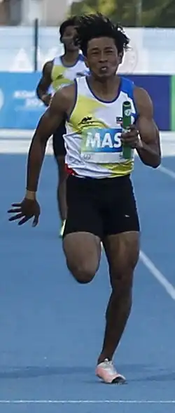 Khairul Hafiz bin Jantan (born 22 July 1998) is a Malaysian sprinter, competing in events ranging from 100 metres to 400 metres. He was the former Malaysian 100 metres outdoor record holder with a time of 10.18 seconds. Khaiful Hafiz, representing home state Malacca, had broken the record set by Watson Nyambek (10.38 set in 1998)[5] during the Malaysia Games in Kuching in 2016.[6][7][8][9] His personal best of 20.90 seconds in the 200 metres was the Malaysian national junior record.