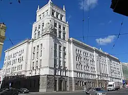 In the 1920s and 30s, a number of prestige construction projects in new officially-approved Constructivist style were completed.[53] Among these were the Derzhprom (Palace of Industry) then the tallest building in the Soviet Union (and the second tallest in Europe),[54] the Red Army Building, the Ukrainian Polytechnic Institute of Distance Learning (UZPI), the Kharkiv City Council building, with its massive asymmetric tower, and the central department store that was opened on the 15th Anniversary of the October Revolution.[8] As new buildings were going up, many of city's historic architectural monuments were being torn down. These included most of the baroque churches: Saint Nicholas's Cathedral of the Ukrainian Autocephalous Orthodox church, the Church of the Myrrhophores, Saint Demetrius's Church, and the Cossack fortified Church of the Nativity.[55]