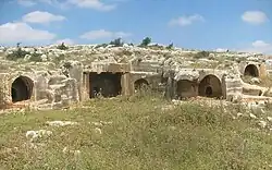 About 200 meters to the east of the ruins, in a quarry that was probably used to build the settlement's houses, a necropolis was found, where 18 burial caves with kokhim are visible, with a number of open-air trough tombs carved between them.[7][10]