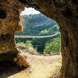 Khndzoresk is widely famous for its canyon with picturesque rock formations and ancient cave settlement. The artificial caves, some of which are currently used as stables and warehouses, used to be inhabited till the 1950s. In the bottom of the gorge there is St. Hripsime church, dating back to the 17th century. On a spur beyond on the right side of the gorge there is Anapat (hermitage) with the tomb of Mkhitar Sparapet. The cave church of St. Tatevos can also be found nearby.[3]